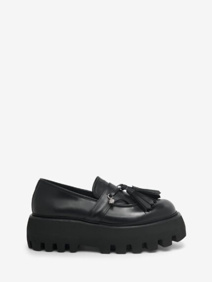 The Sofa Loafer – black smooth leather with a round toe silhouette. Double tassel detailing with Skull charm hanging from