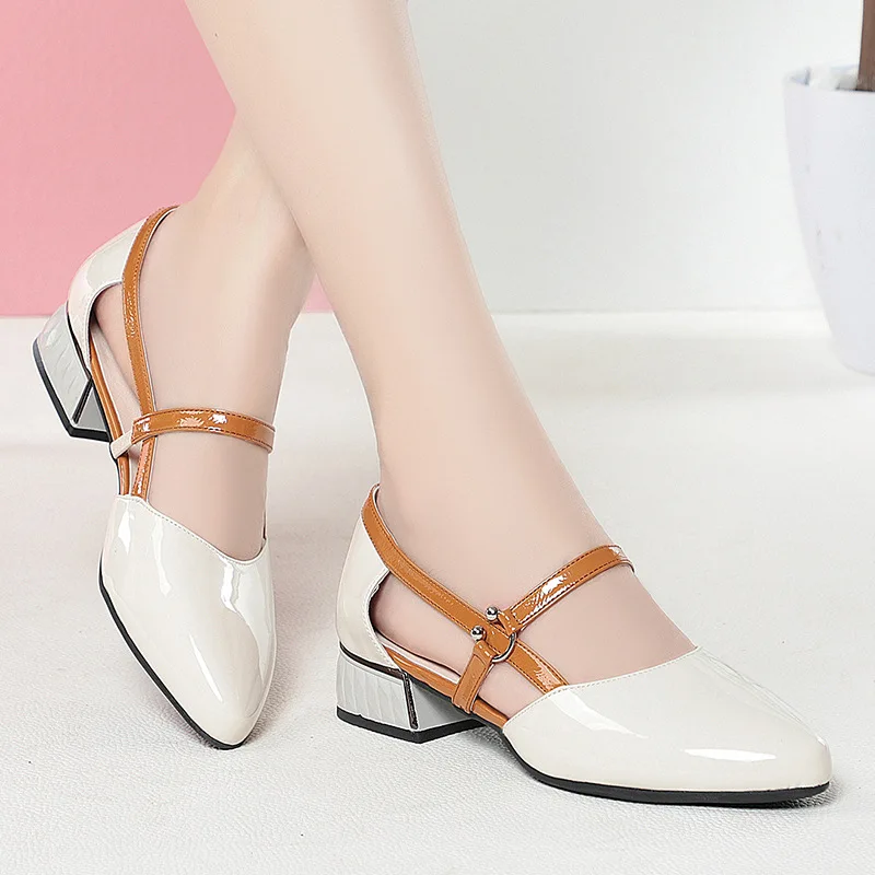 2024 Soft Leather Sandals Women Spring Summer Fashion Pointed Tip Single Shoes Low-Heel Hollow Buckle Ventilate Office Gentle