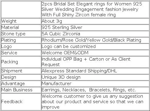 2pcs Bridal Set Elegant rings for Women 925 Sliver Wedding Engagement fashion Jewelry With Full Shiny Zircon female ring