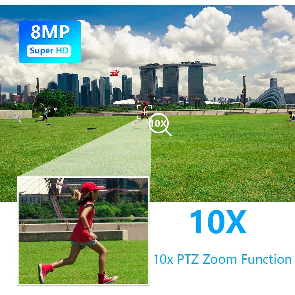 4K 8MP Dual Lens WIFI Solar Camera Outdoor 10X Optical Zoom Two-way Audio Color Night Vision Bulit-in Battery Security Camera