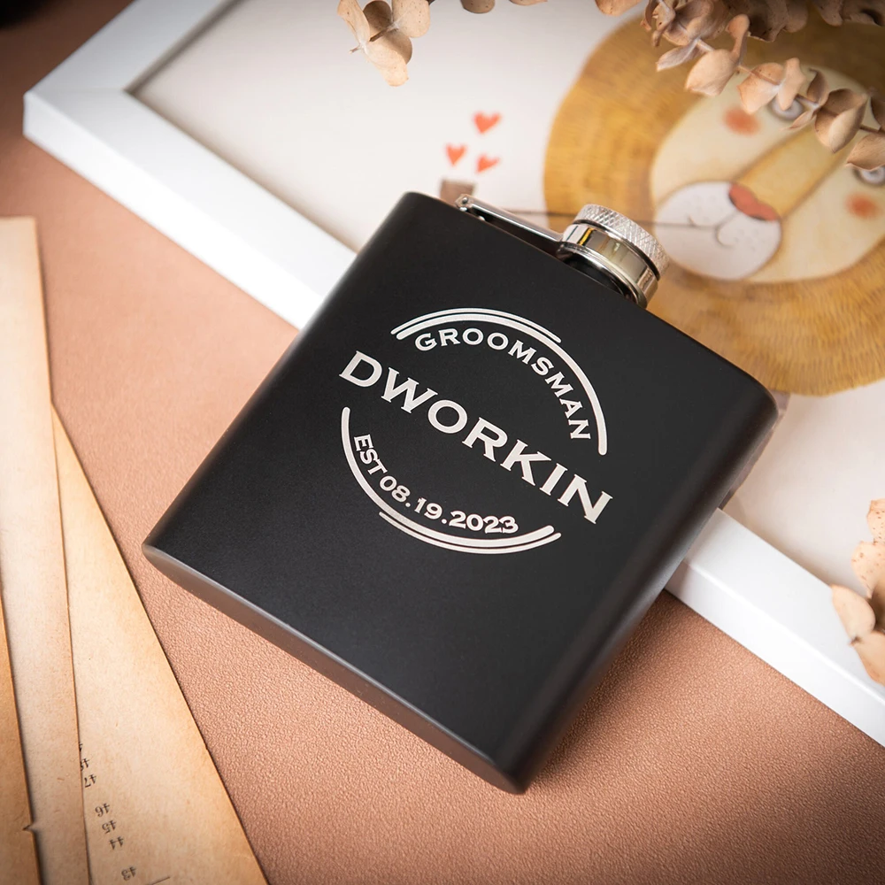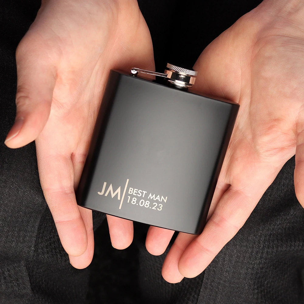 Custom Groomsmen Gift Engraved Best Men Black 6oz Hip Flask with Gift Box Set Personalised Gift for Him Fathers Day Dad Gift