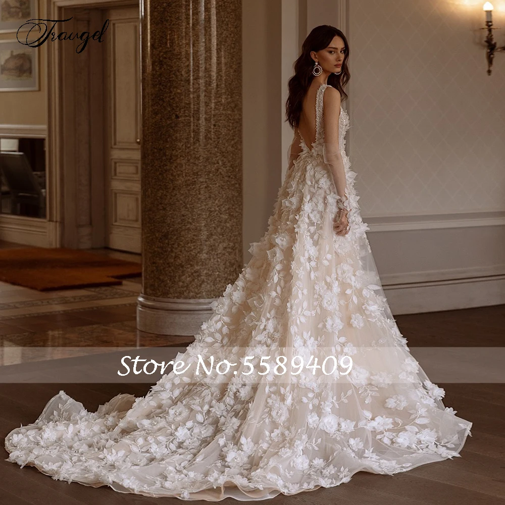 Customized A-Line Romantic Wedding Dresses V-Neck Sleeveless Vestido De Novia Lace Appliques 3D Flowers Classic Robe De Mariee
