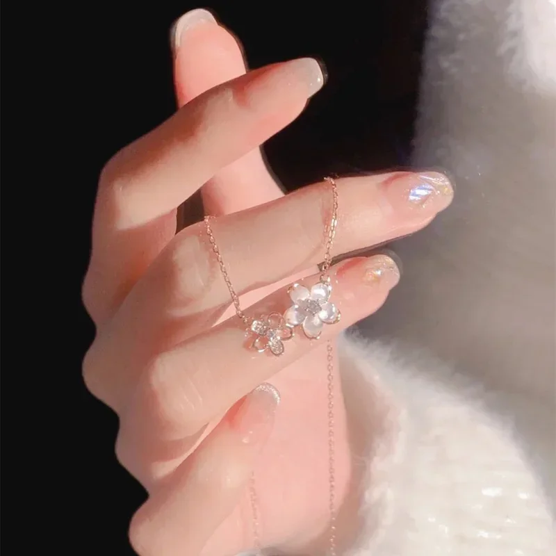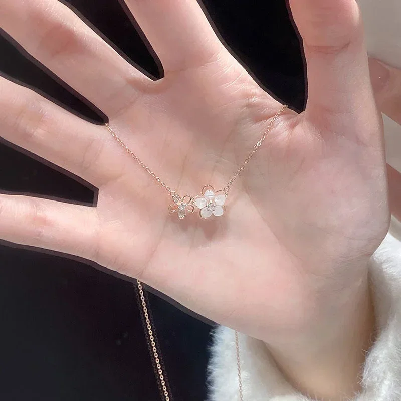 Cute Sweet Zircon Peach Blossom Pendant Clavicle Necklace Women Simple Light Luxury Two Flowers Neck Chain Jewelry