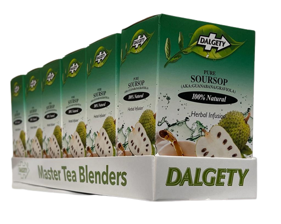 Dalgety’s Pure Soursop is 100% natural, caffeine free, tropical Infusion. The infusion has a mild subtle enticing taste associated with all the benefits of the great soursop plant.