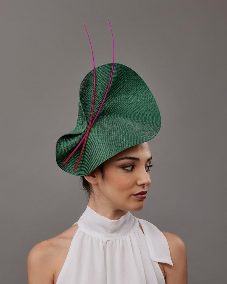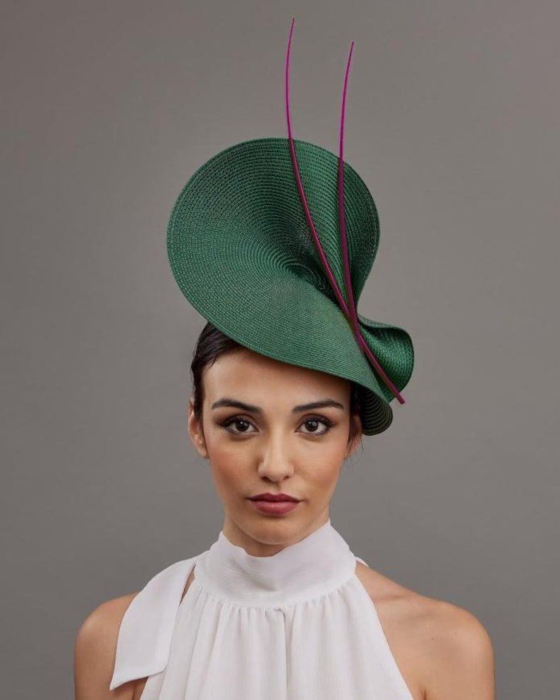 Dark Green and pink wedding hat for woman. The forest green fascinator hat is decorated with two pink feathers. This Green women’s hat with pink feathers it´s perfect for weddings and any special event.