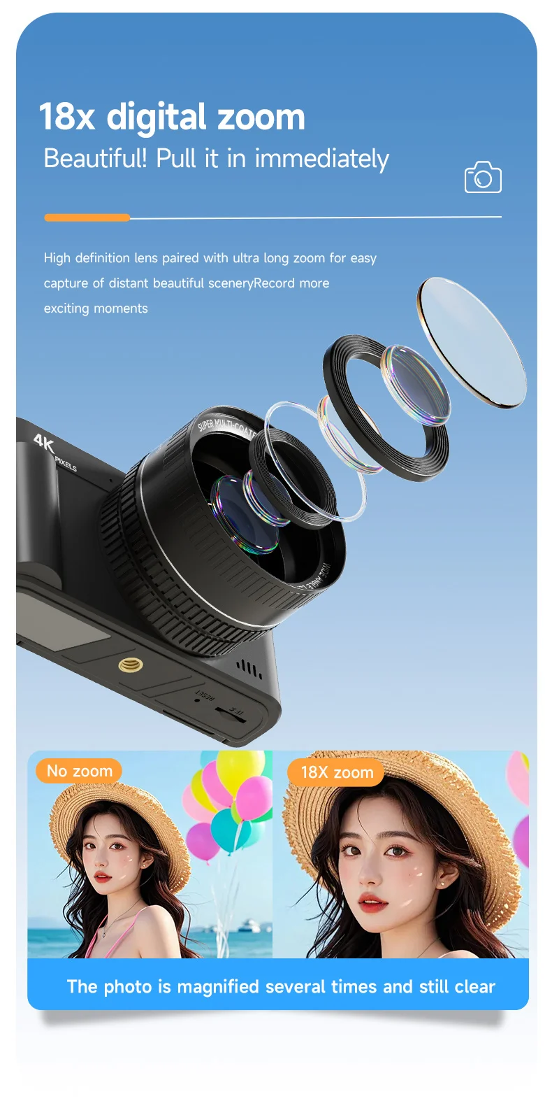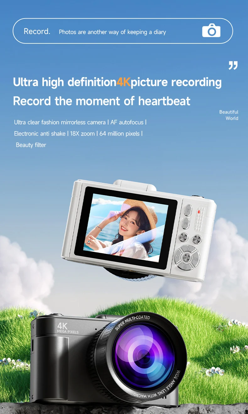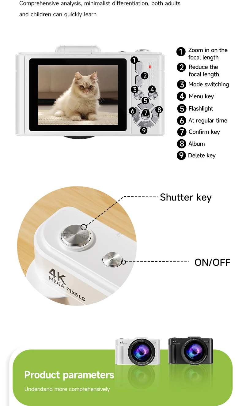 2. 18x Zoom: Equipped with a 2.8 inch screen and 18x digital zoom, this 4K digital camera allows you to zoom in or out using the W/T button while taking photos or recording videos, capturing close up shots or distant objects.
