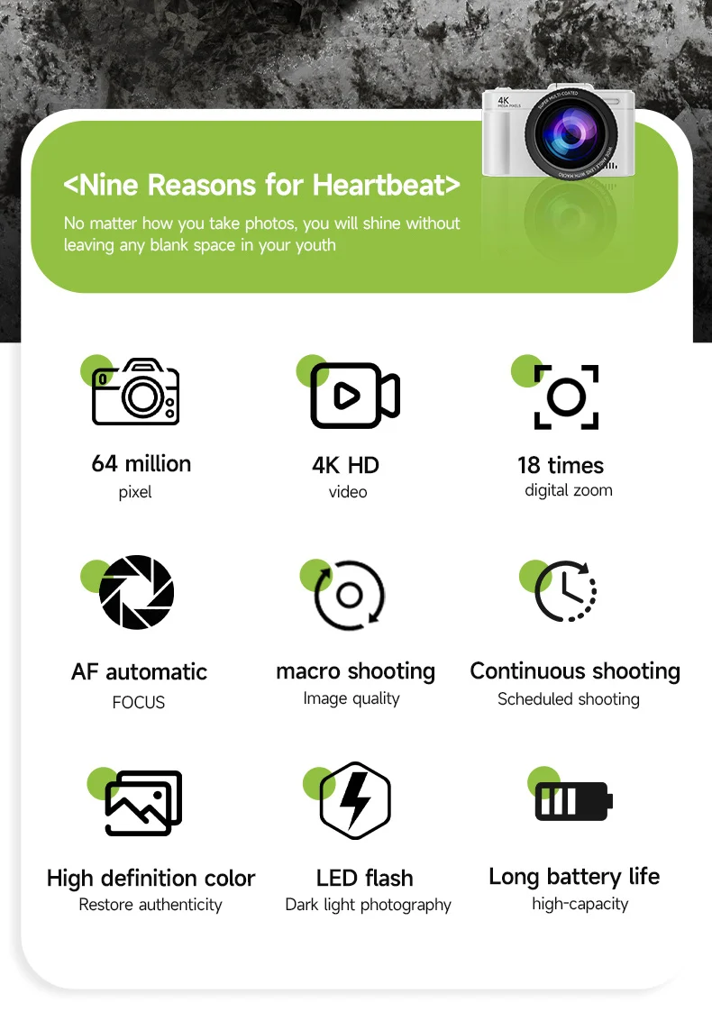 3. Multifunctional: The digital camera offers functions such as white balance, continuous shooting, autofocus, stabilization, and face detection. The video pause function helps save editing time and memory, while time lapse photography and slow motion features enable you to create the perfect shot you desire!