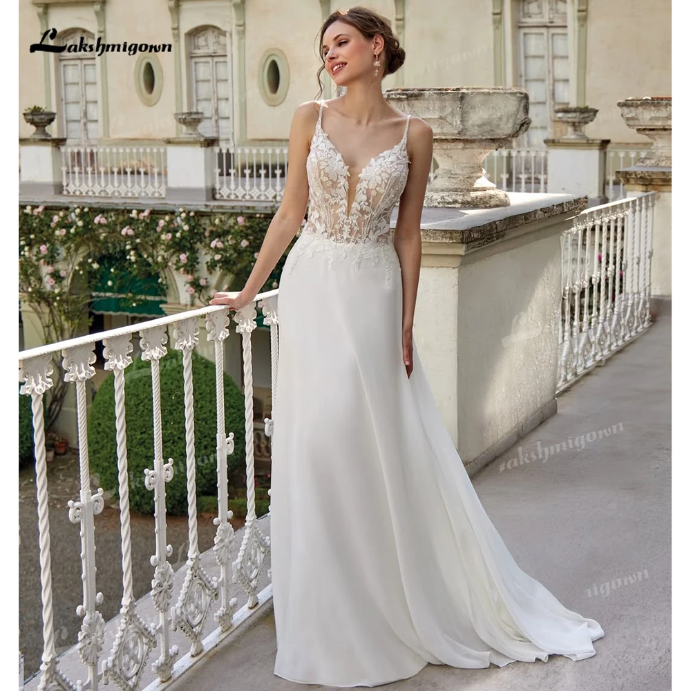 Elegant Chiffon V Neck Boho Wedding Dress 2026 A-Line Lace Applique Bridal Gown Spaghetti Strap Backless Wedding Gown Customized