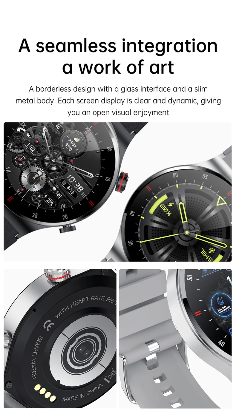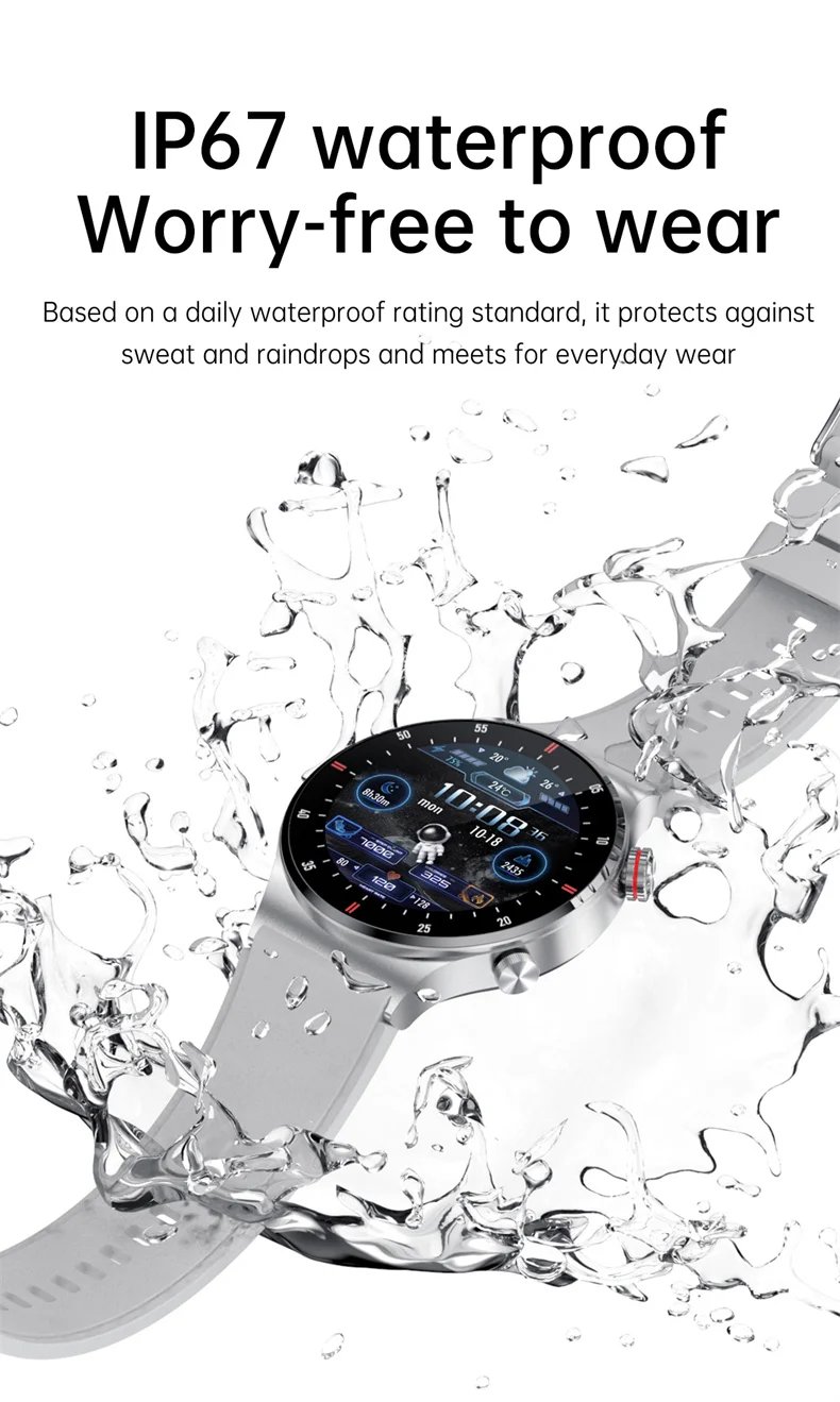 Main functions: date/week display, weather push, physiological cycle (app-gender is set to female only), countdown, card management, remote camera, sedentary reminder, step counting, distance, calories, heart rate/blood pressure/blood Oxygen/Pressure/ECG/Sleep Monitoring, Bluetooth Music Control, Call Reminder, SMS Reminder, Social APP Message Reminder, Alarm Reminder, Exercise Mode, Raise Hand to Brighten Screen, Find Phone, Stopwatch, Reject Call, Do Not Disturb Mode, and more Dial switching, brightness adjustment, firmware upgrade, etc.