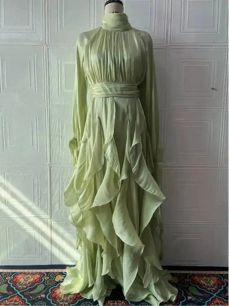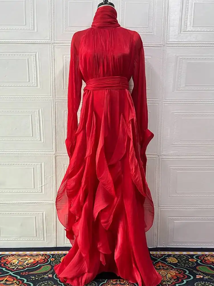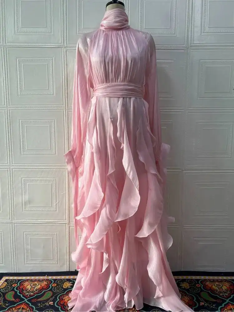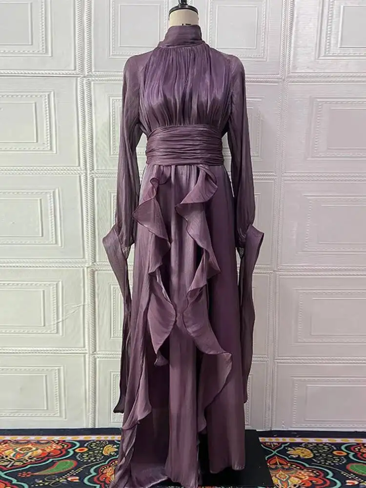 LGRQ early autumn turtleneck full sleeves shinny ruffles pullover Arabic styles floor length vacation dress female vestido