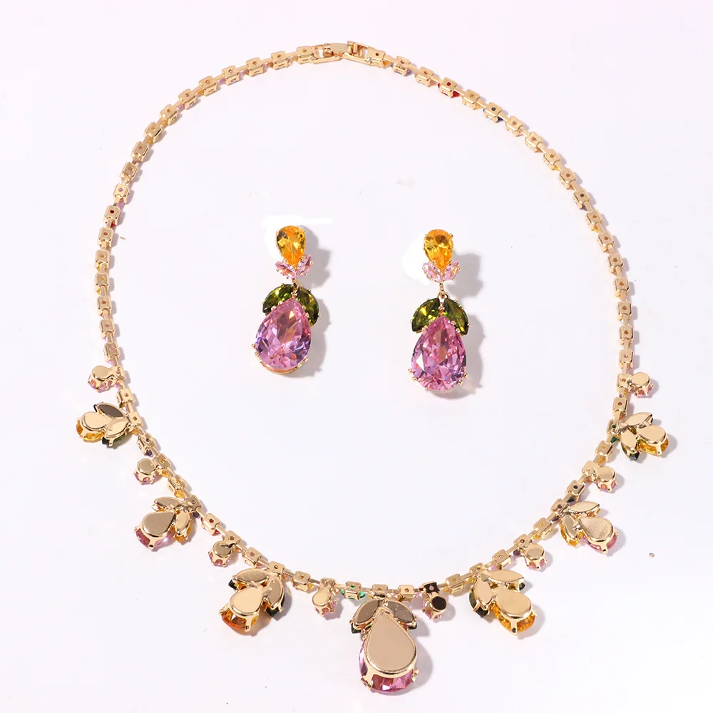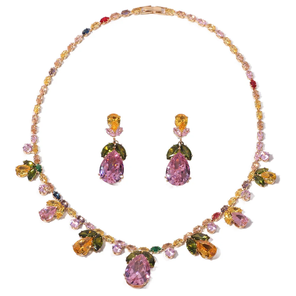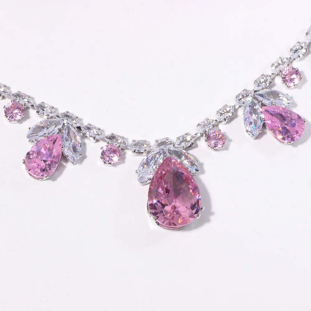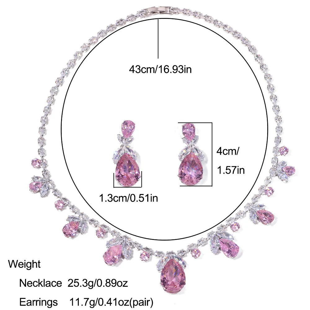 Luxury Waterdrop Pendant Jewelry Set Earring Pink Necklace For Women Bridal Wedding Exquisite Fashion Zircon Party Banquet Gift