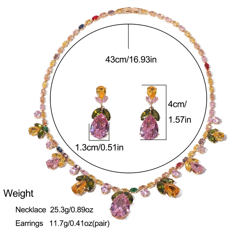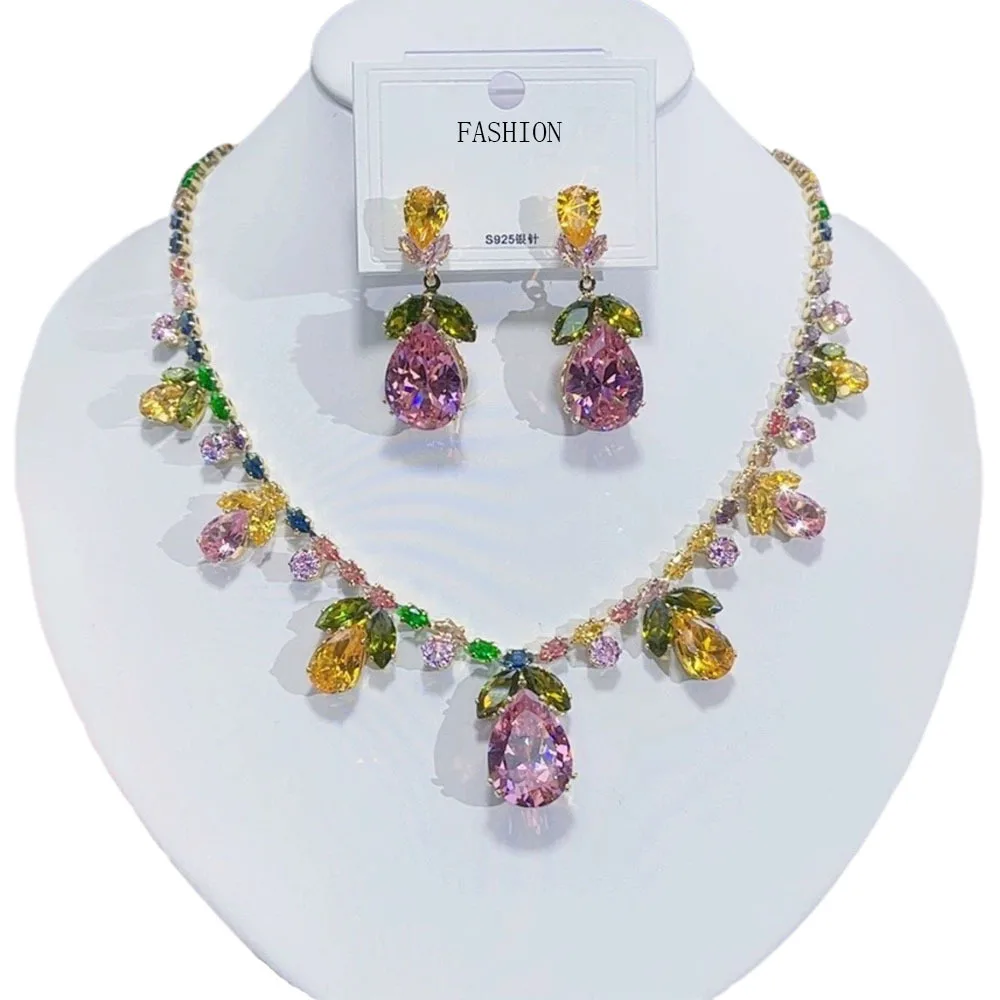 Luxury Waterdrop Pendant Jewelry Set Earring Pink Necklace For Women Bridal Wedding Exquisite Fashion Zircon Party Banquet Gift