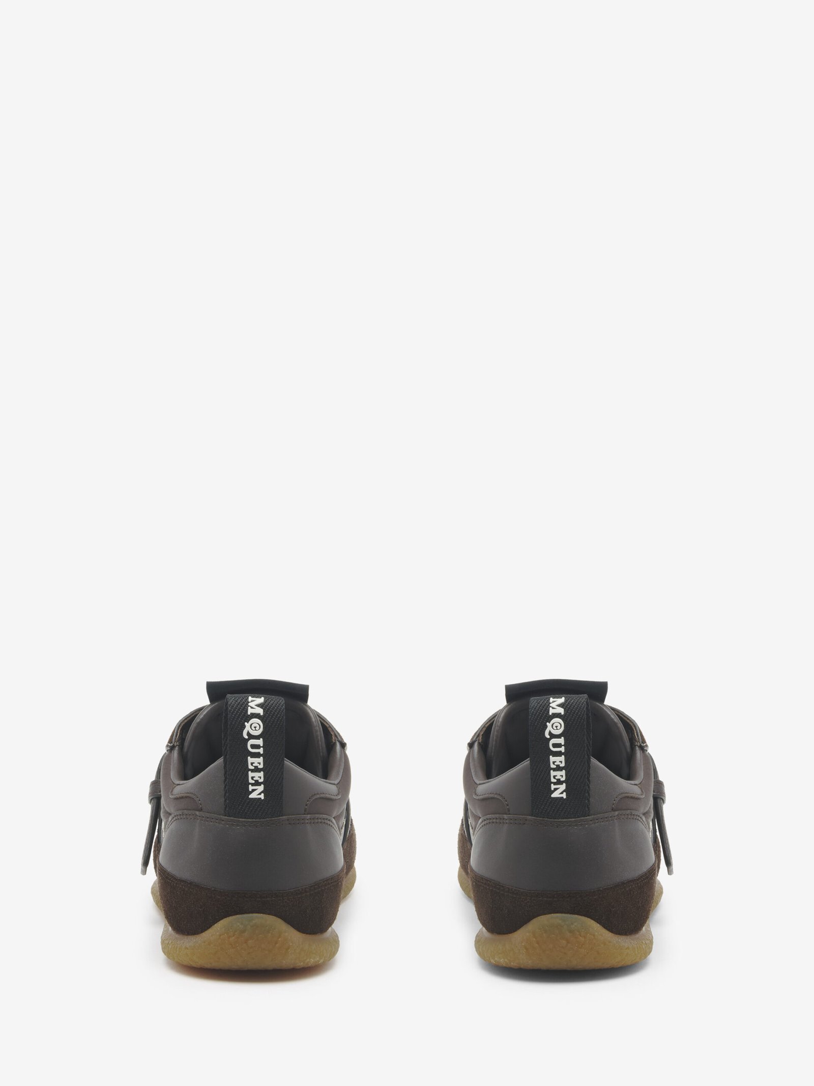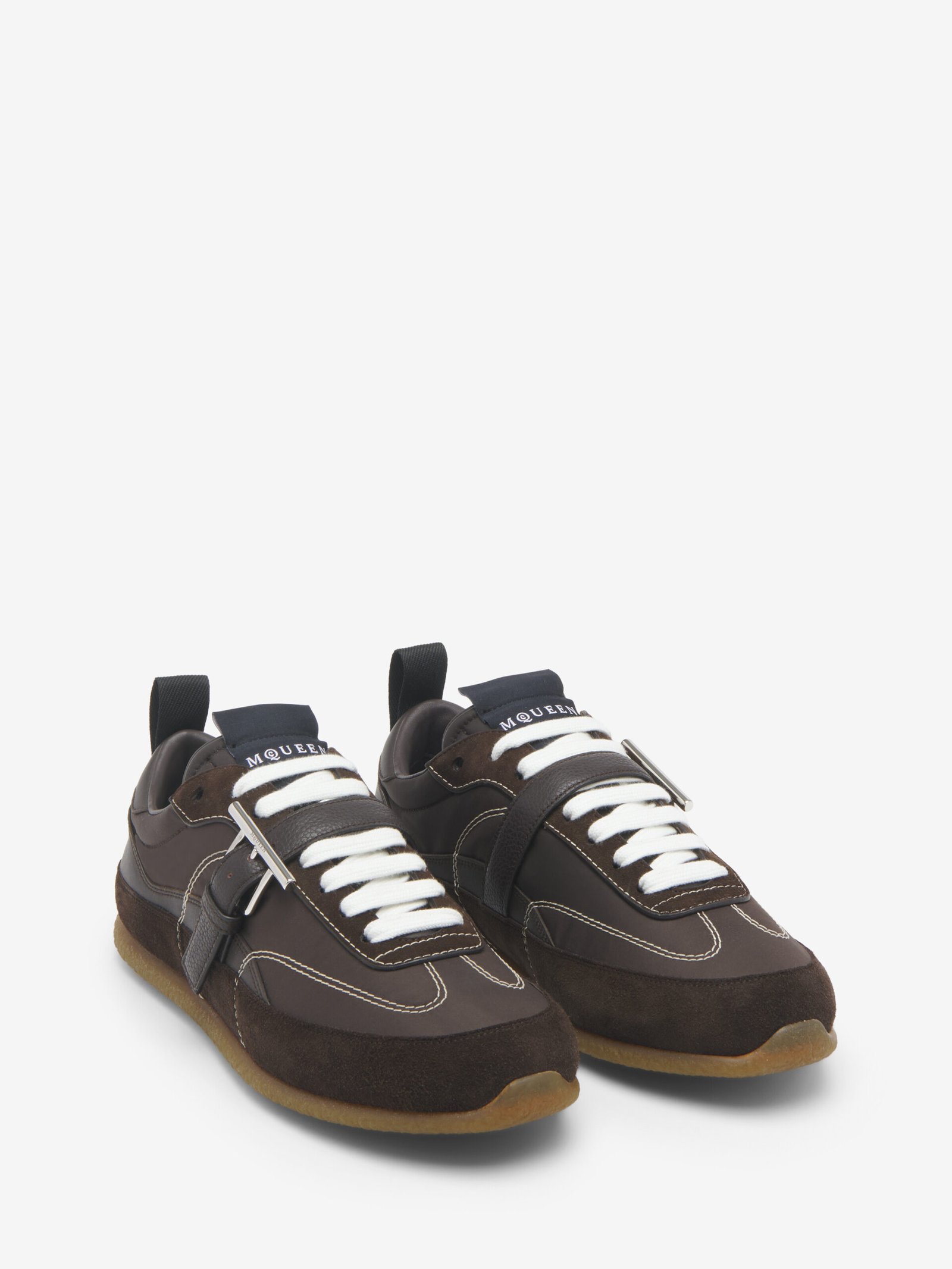 The EC1 T-Bar Sneaker – sleek round-toe silhouette in trench brown with a retro-inspired aesthetic. The shoe features silver-tone metal T-bar detailing on the side. Finished with topstitching and McQueen logo on the back.