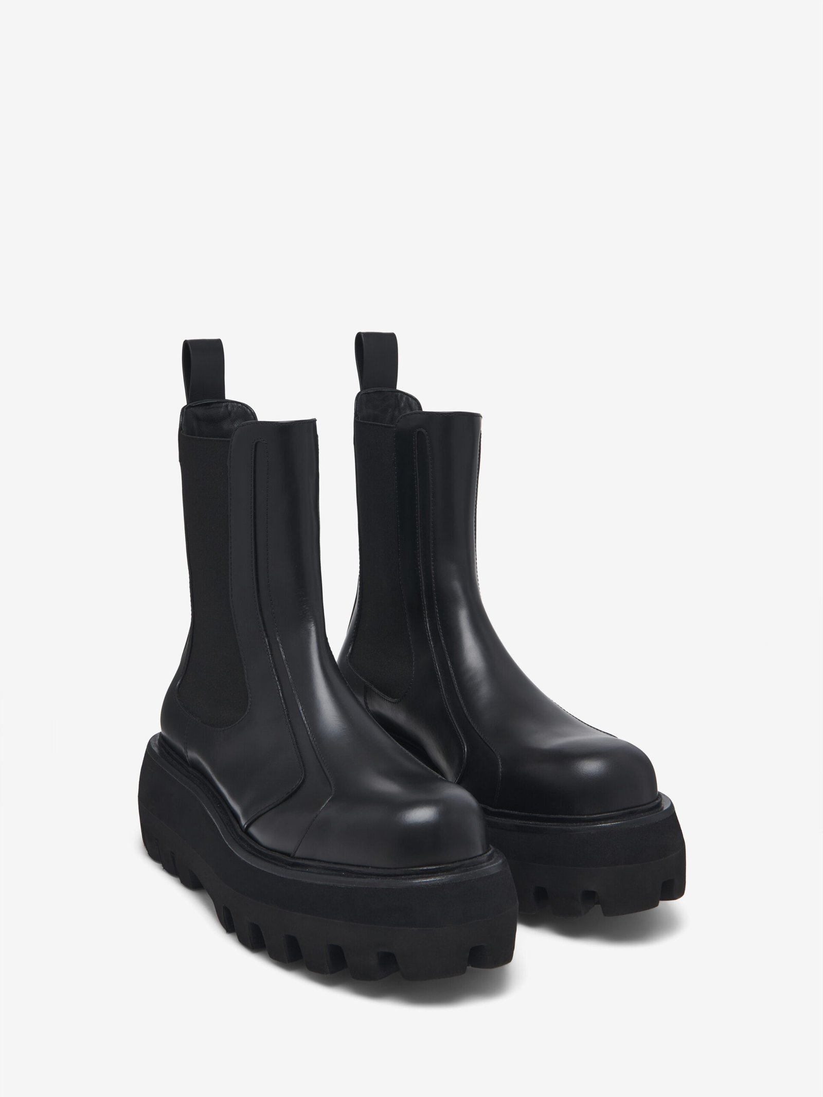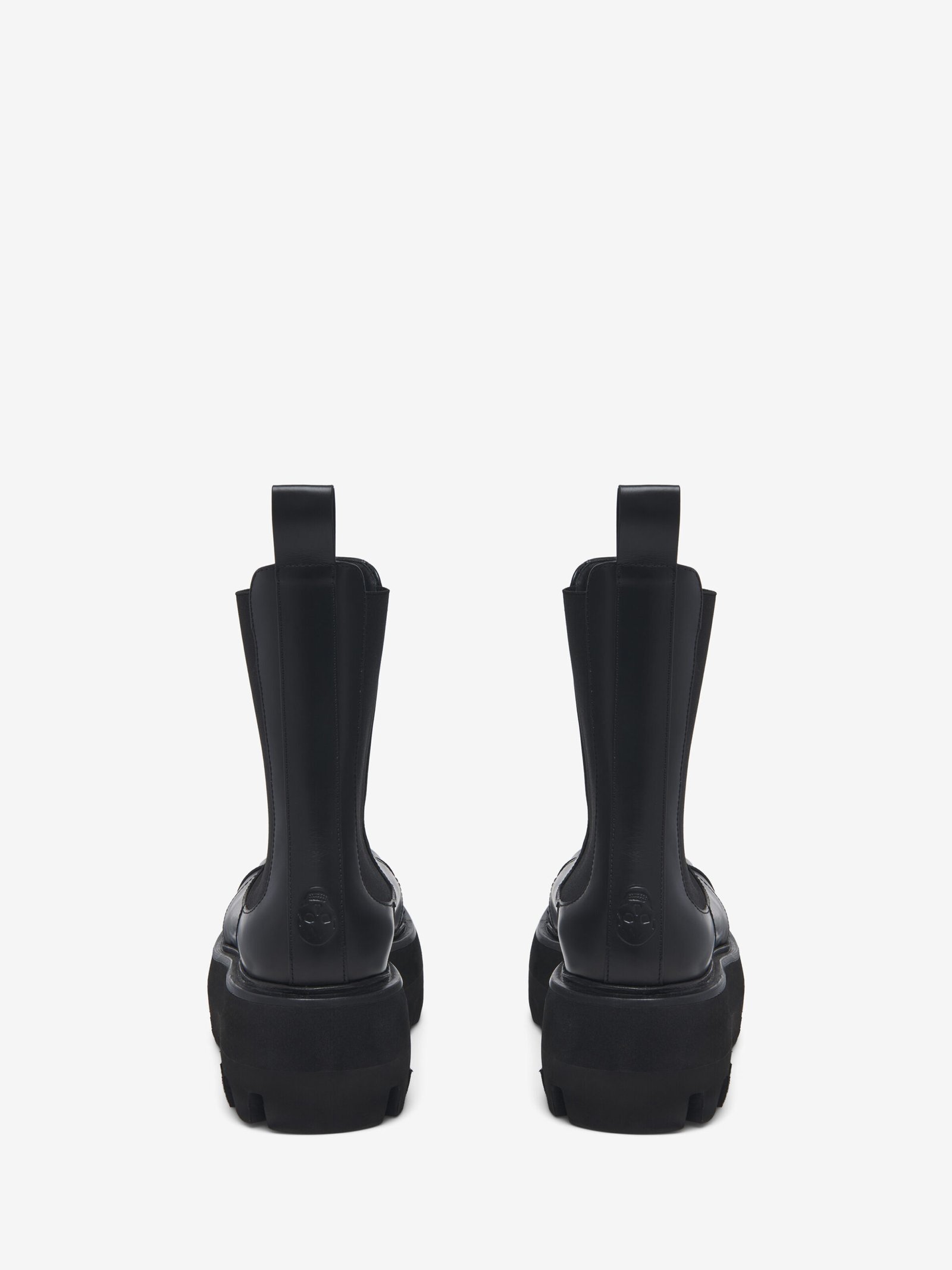 The Sofa Chelsea boot – industrial-inspired. Black smooth calf leather with a round toe silhouette and a lightweight chunky lug sole. Finished with an embossed inverted skull detail.