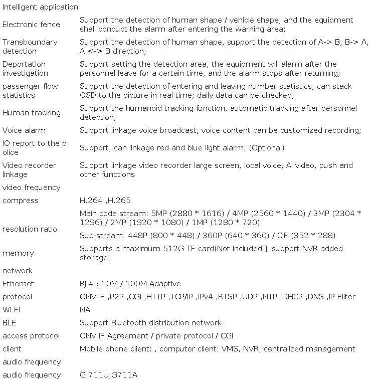 this Camera adopts highly integrated Hisilicon 3516CV610, Support 5MP 25 fps realtime code;extremely low power consumption and strong stability; supports H.265 compression algorithm to ensure image quality while effectively reducing network bandwidth occupation; powerful network function, support standard Support Hik vision protocol, and compatible with iVMS-4200, support RTSP, ON VIF and other protocols, support alarm picture upload FTP server, alarm picture to E-Mail, support mobile phone remote monitoring;