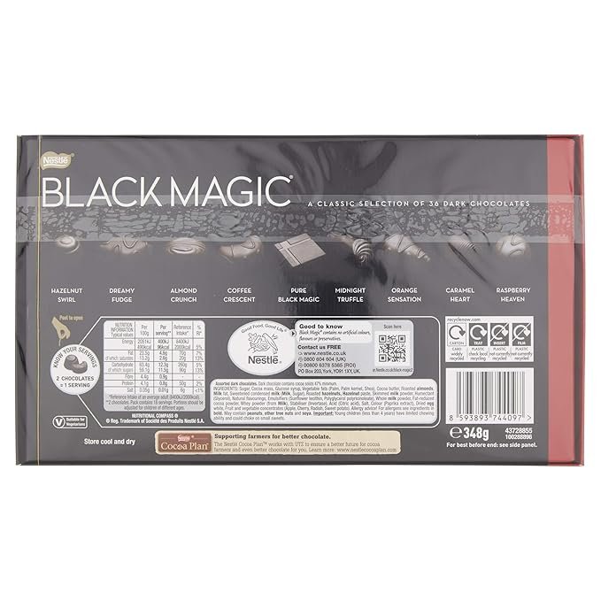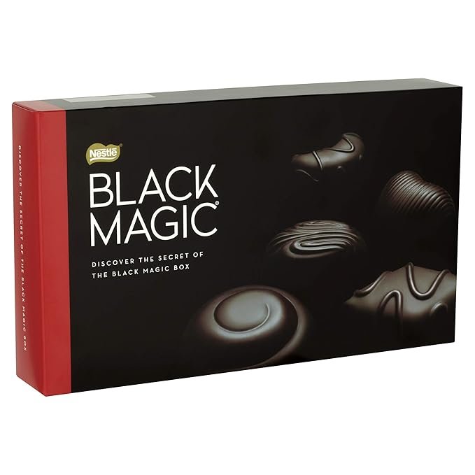 Item detailsBrand Name Blackmagic Item Form Bar Occasion Birthday, Christmas, Congratulations Chocolate Type Dark Flavor Almond, Caramel, Chocolate, Coffee, Orange Package Type Name Box Container Shape Rectangular Global Trade Identification Number 08593893744103 Manufacturer Nestle Form Factor Box Item Shape rectangular prism Variety Dark Chocolate Variety Part Number 12244275 Model Number 12244275 Container Type Box Cultivation Method Claim No Chemical Fertilizers, No Pesticides Cuisine Swiss Age Range Description 13+ Best Sellers Rank - #126,686 in Grocery & Gourmet Food (See Top 100 in Grocery & Gourmet Food)