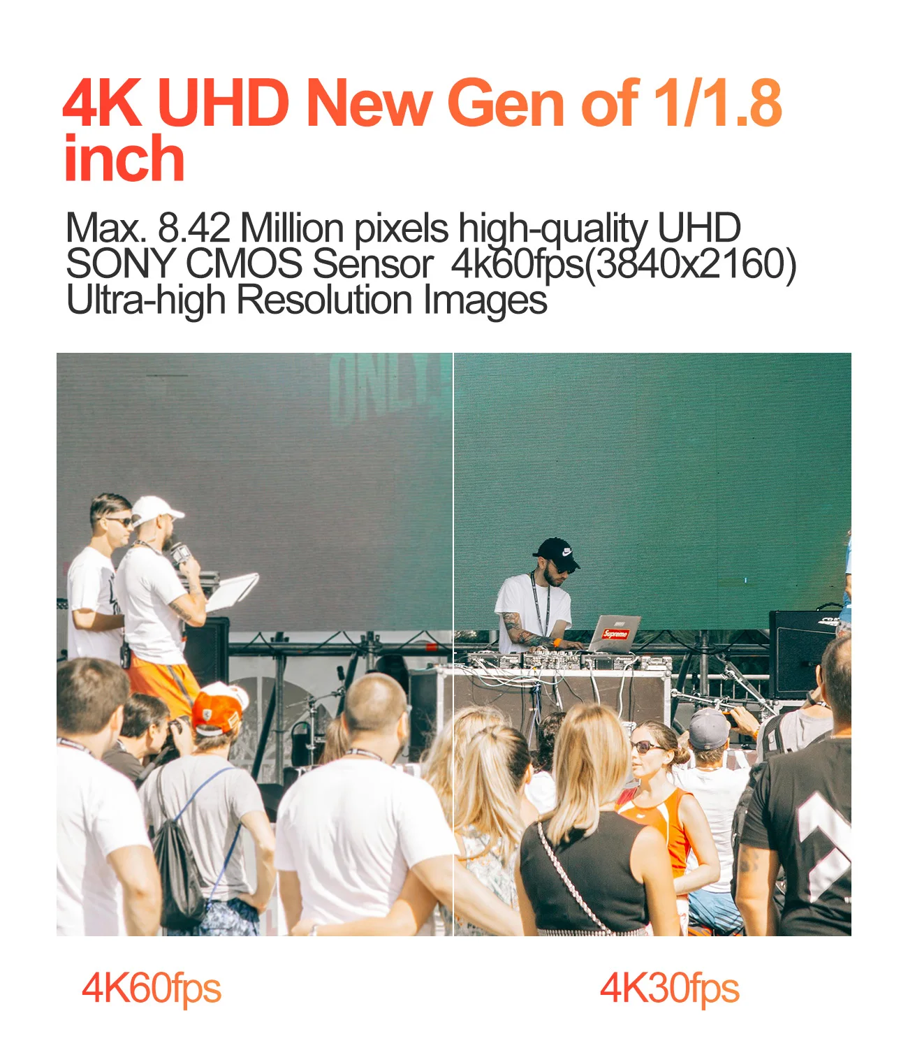 Use 1/1.8-inch high-quality UHD CMOS sensor with a maximum of 8.42 million pixels can realize 4K (3840×2160) 60fps ultra-high-resolution high-quality images. And downward compatible with 1080p, 720p and other resolutions.